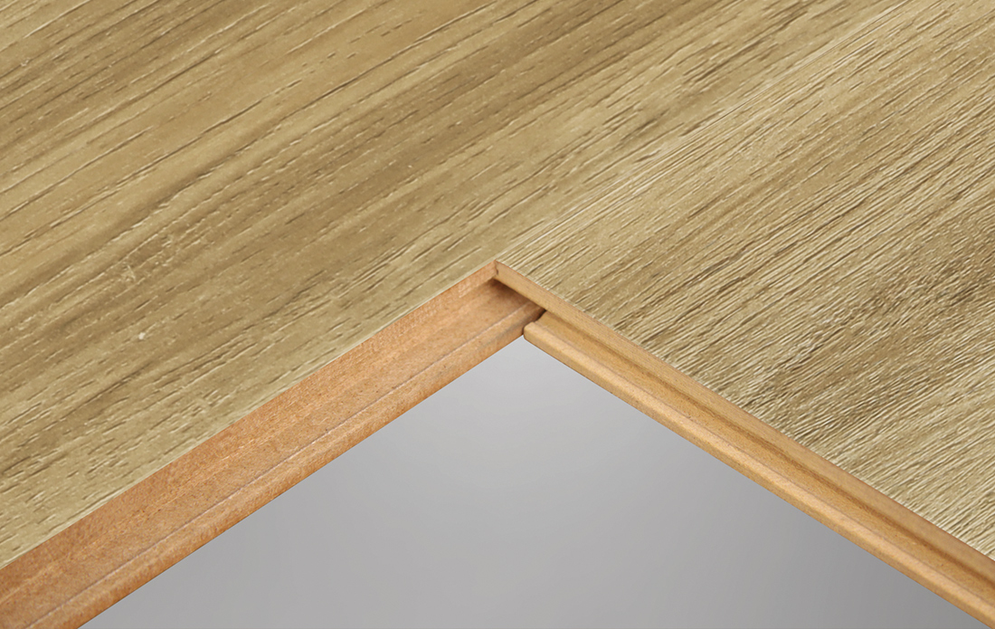 双拼的展示能够更加清楚直观地看到地板的拼接实情,地板四周采用的是模压倒角技术处理,整体铺装极具立体效果。
